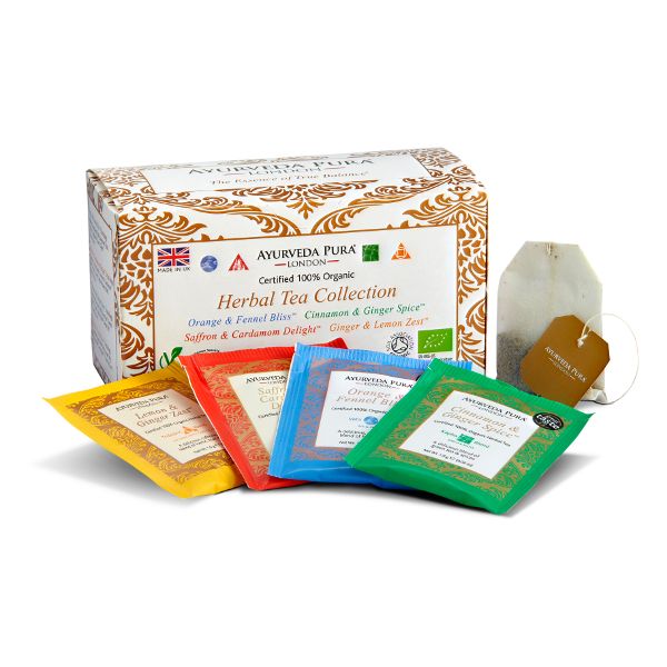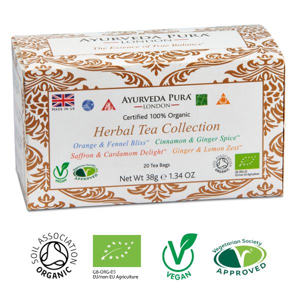 Ayurveda Pura presenta su colección de tés herbales que incluye cuatro exquisitas mezclas, elaboradas a partir de una combinación de hojas, frutas, flores y cortezas de hierbas orgánicas naturales al 100%, especialmente seleccionadas por destacados practicantes de Ayurveda. Estos tés negros especiales son mezclados a mano en Londres, Reino Unido, y tienen un sabor único.