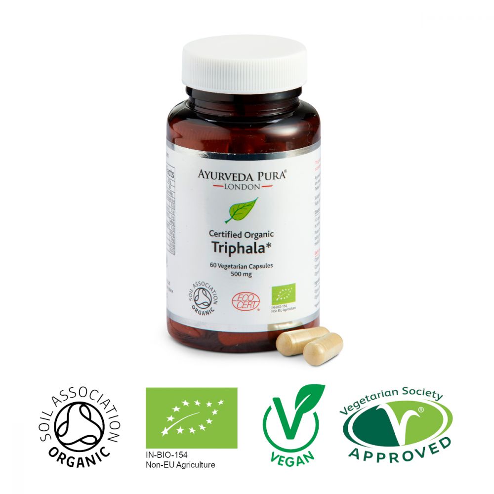 Nuestro Triphala es certificado como orgánico por ECOCERT de acuerdo con la Regulación del Consejo Europeo (CE). Es adecuado para veganos y aprobado por la Sociedad Vegetariana del Reino Unido.